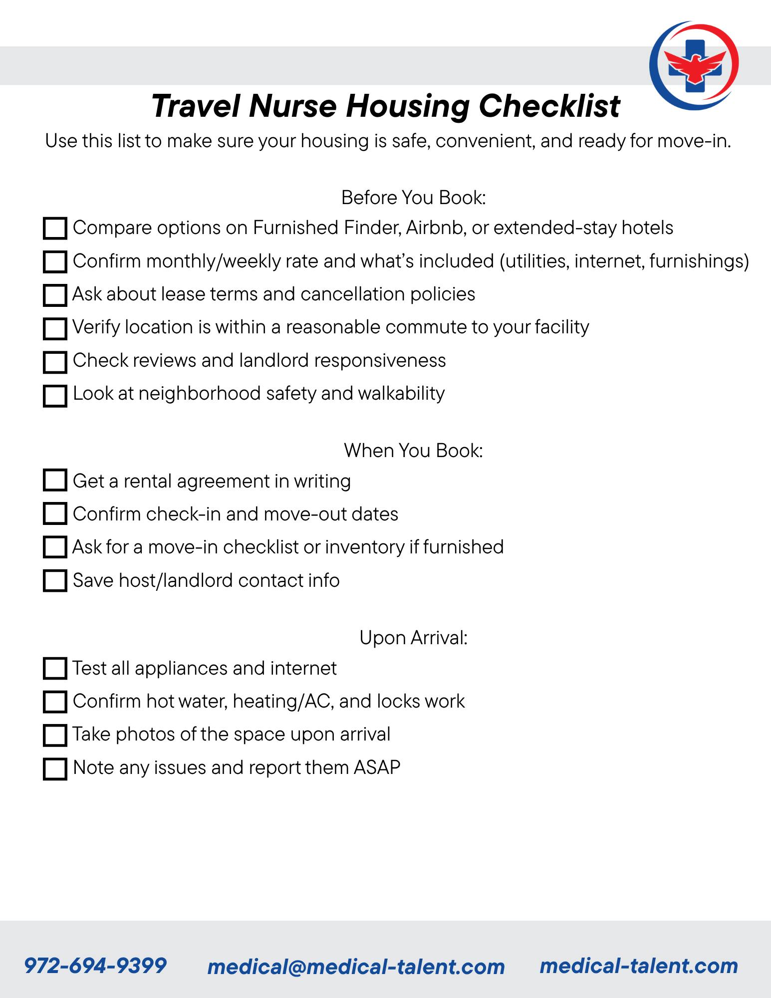 At Medical Talent, our travel nurses receive a tax-free housing stipend, giving you the flexibility to choose where and how you live during your nursing assignment. Whether you prefer short-term rentals, extended-stay hotels, or fully furnished apartments, here’s how to make the most of your housing allowance.